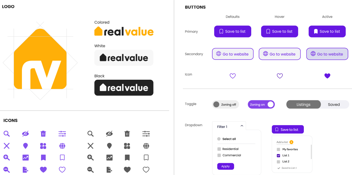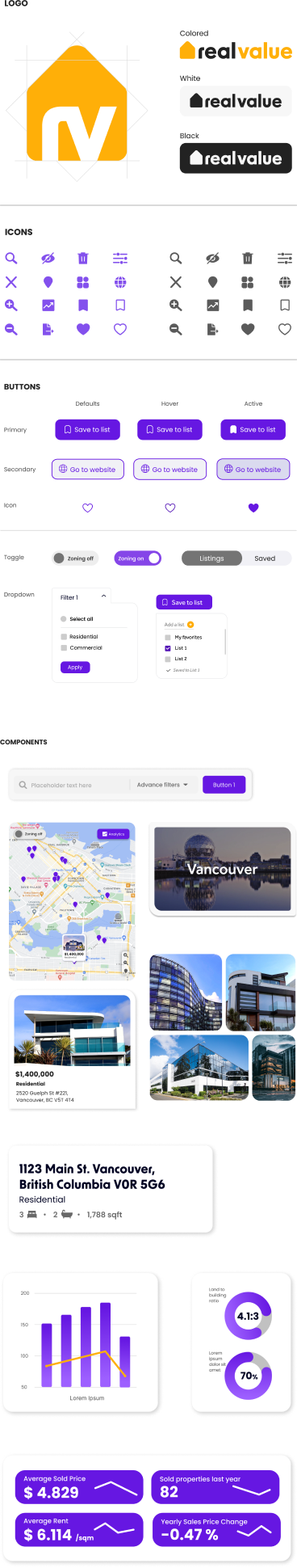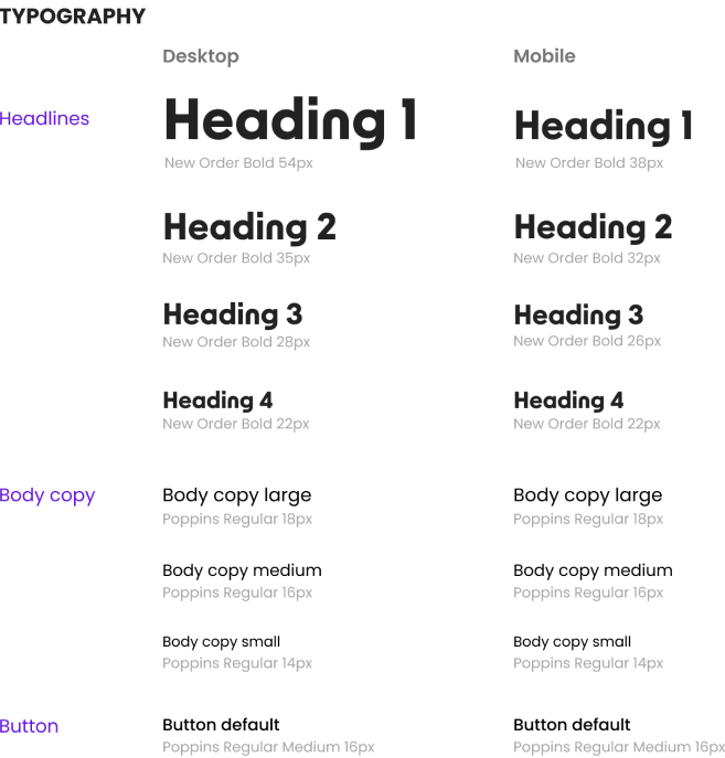 We chose purple as our primary color since it’s a color used in high-end brands that helps us communicate trust and efficiency, and yellow is our accent color because of its great contrast with purple and its vibrancy, perfect to highlight our calls to action. Our typographies, New Order and Poppins, have outstanding readability and are very clean as our logo to maintain a professional look all throughout our brand, where we carefully designed each icon and button so everything works together as a whole