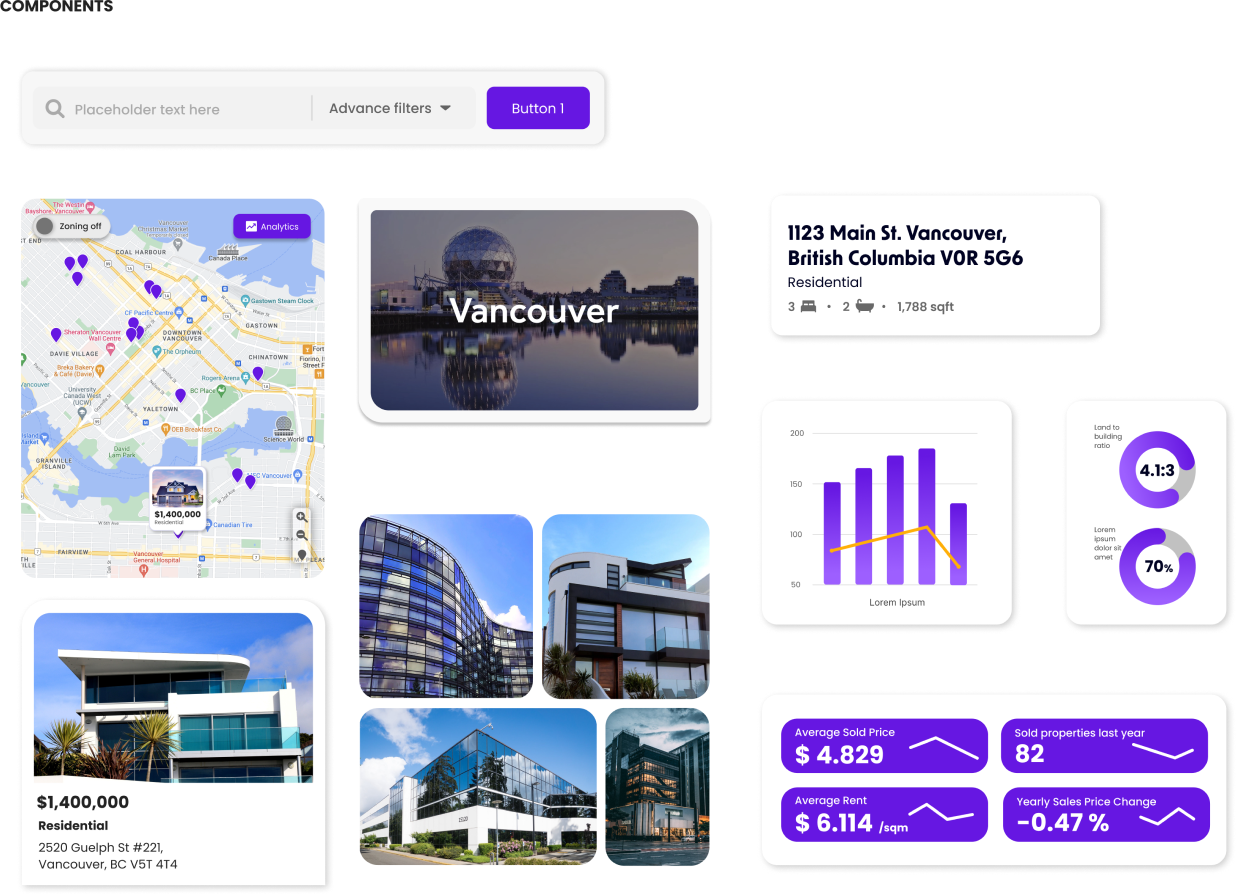 We chose purple as our primary color since it’s a color used in high-end brands that helps us communicate trust and efficiency, and yellow is our accent color because of its great contrast with purple and its vibrancy, perfect to highlight our calls to action. Our typographies, New Order and Poppins, have outstanding readability and are very clean as our logo to maintain a professional look all throughout our brand, where we carefully designed each icon and button so everything works together as a whole